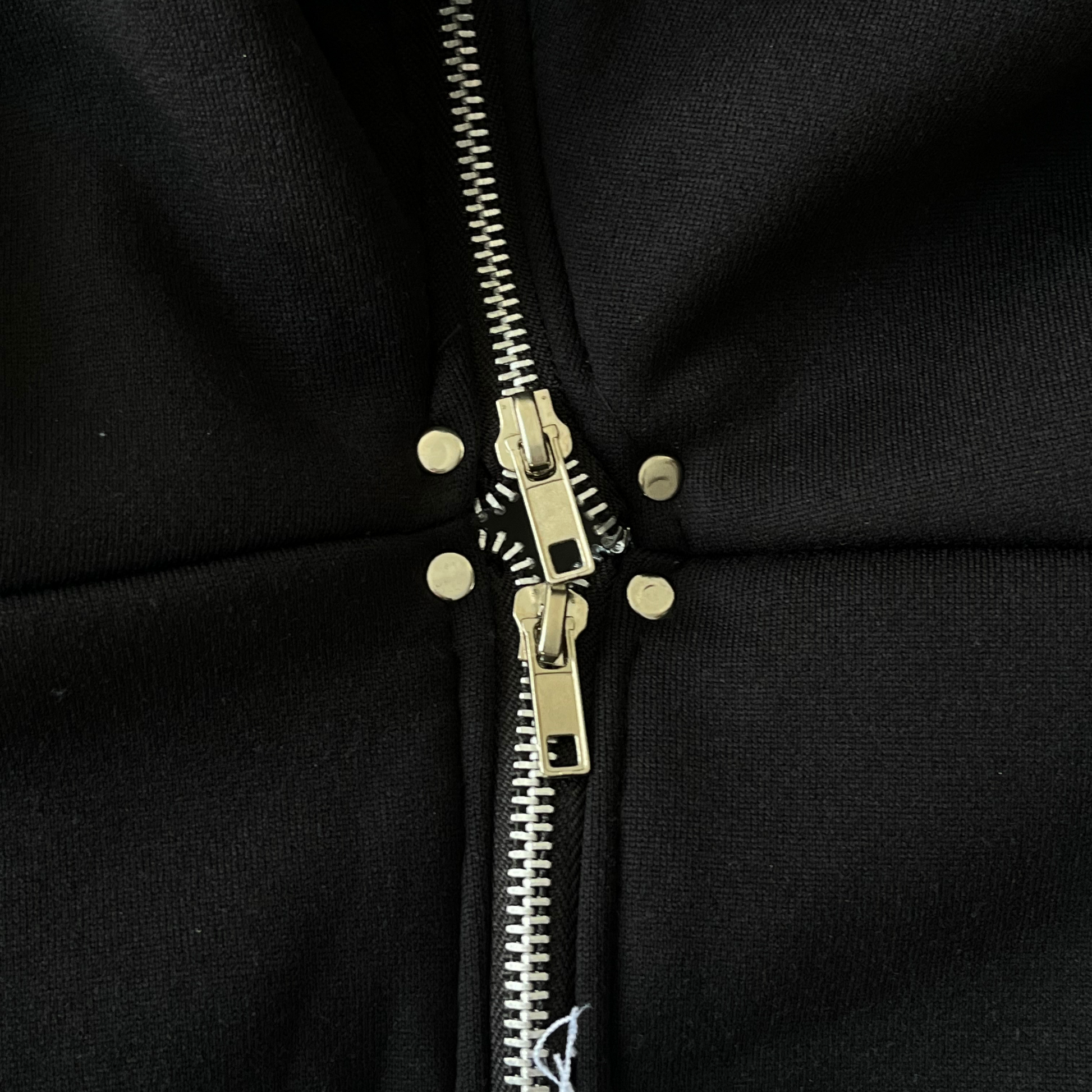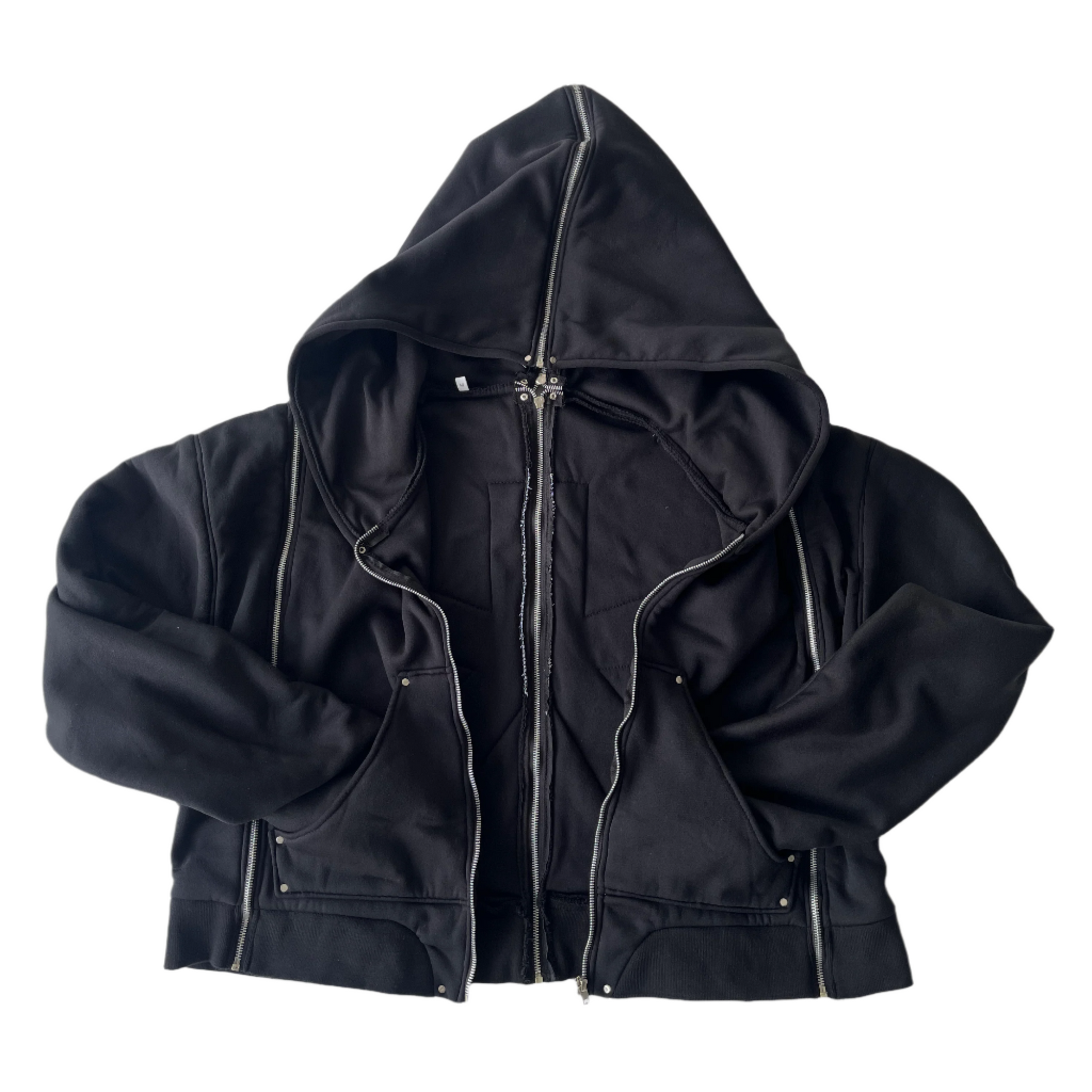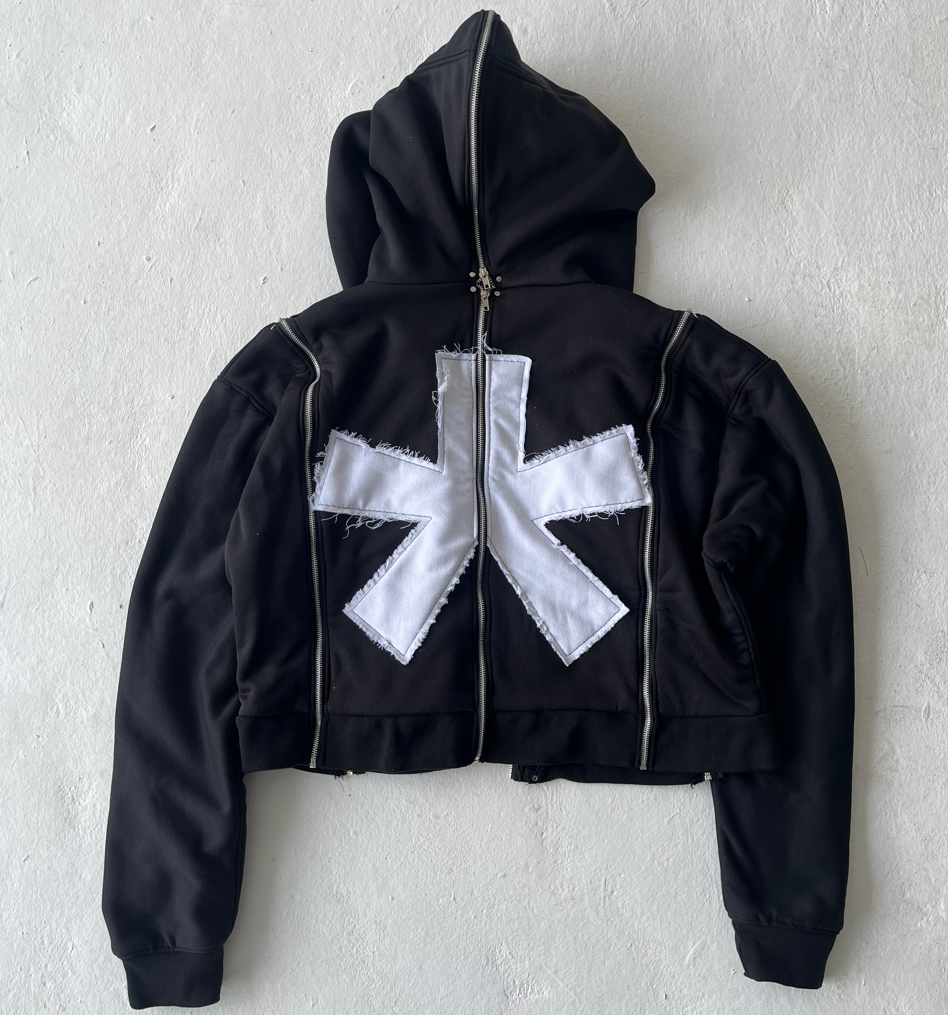 Make a statement with this black cropped zip-up hoodie, designed with an avant-garde edge. Featuring a bold, oversized white asterisk patch stitched onto the back with raw, frayed edges, it delivers a striking contrast against the dark base. The piece is finished with multiple exposed zippers running vertically along the body and center hood, giving it a deconstructed, industrial vibe. Ribbed cuffs and hem provide structure while maintaining comfort. Perfect for adding a rebellious, fashion-forward touch to any streetwear fit.