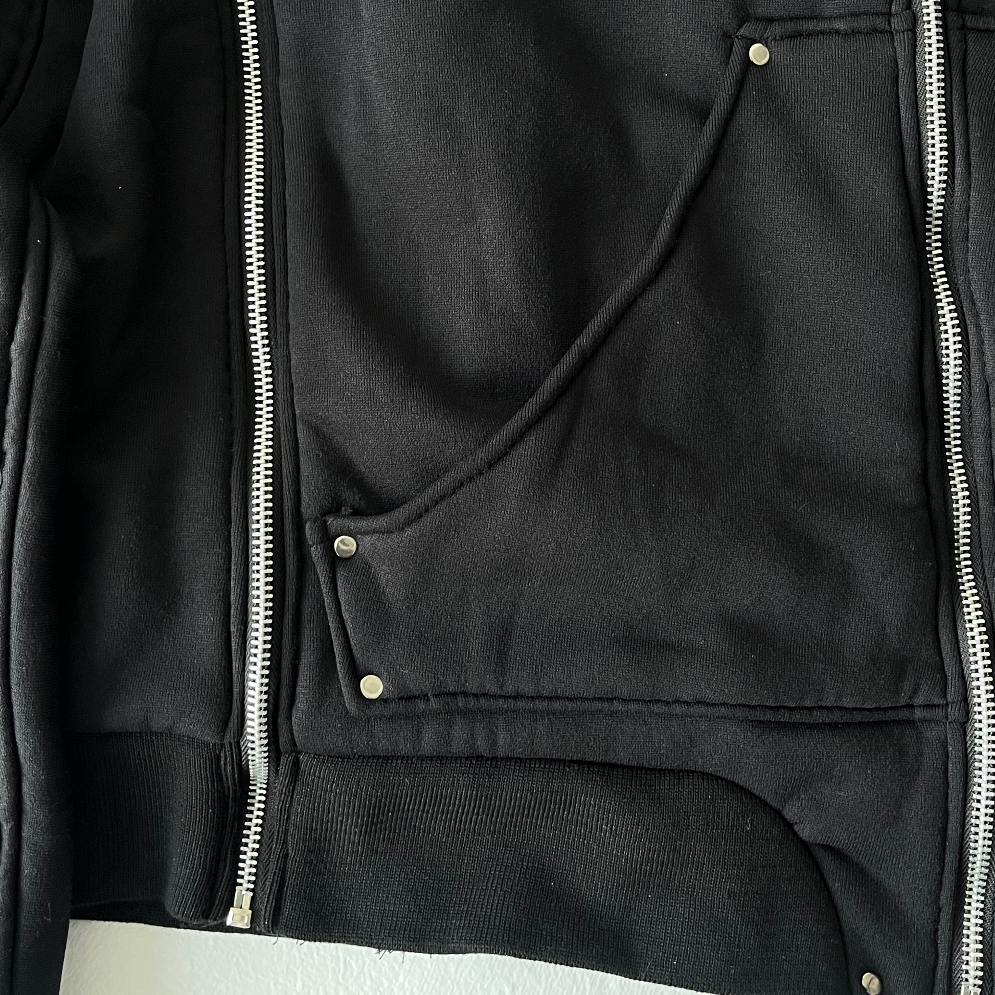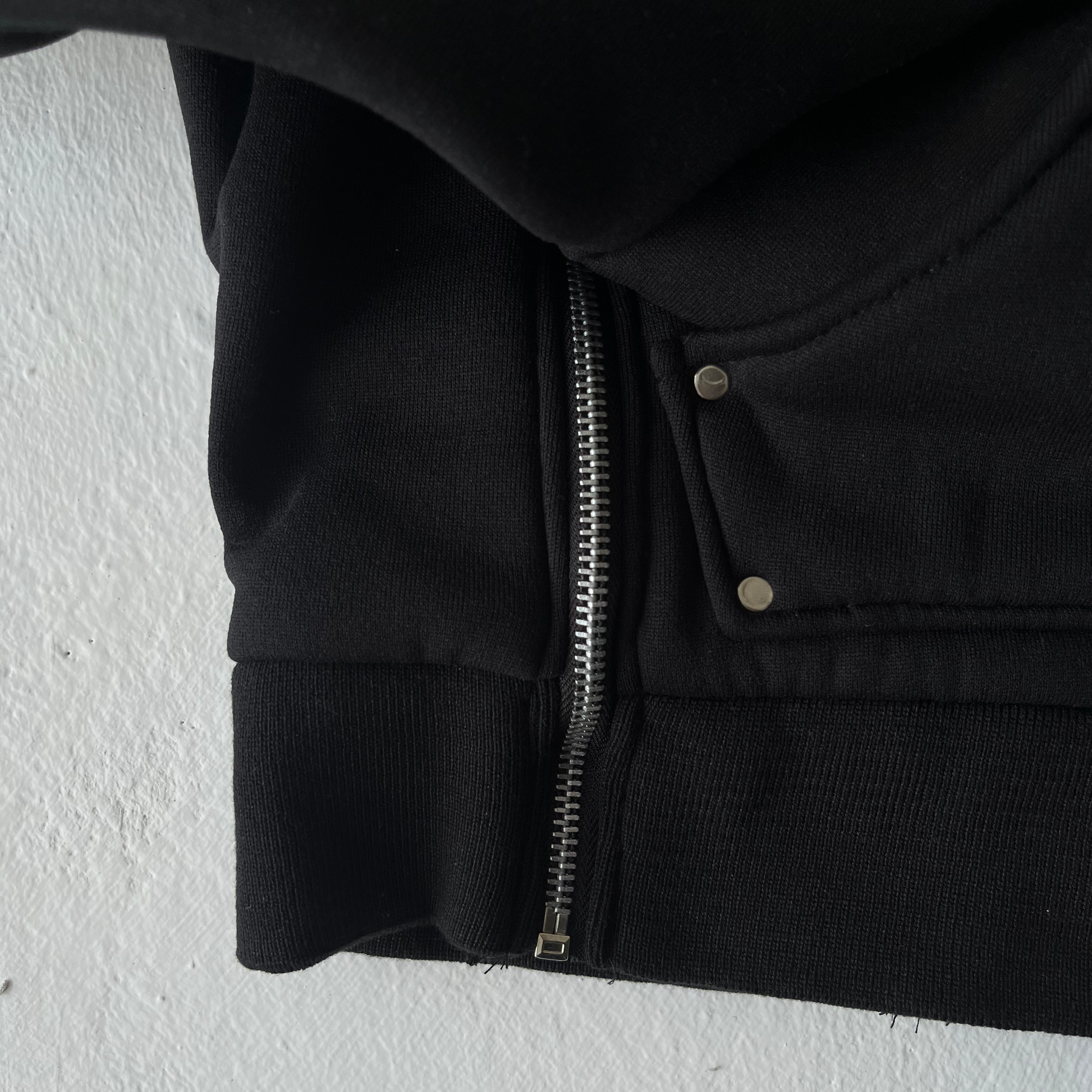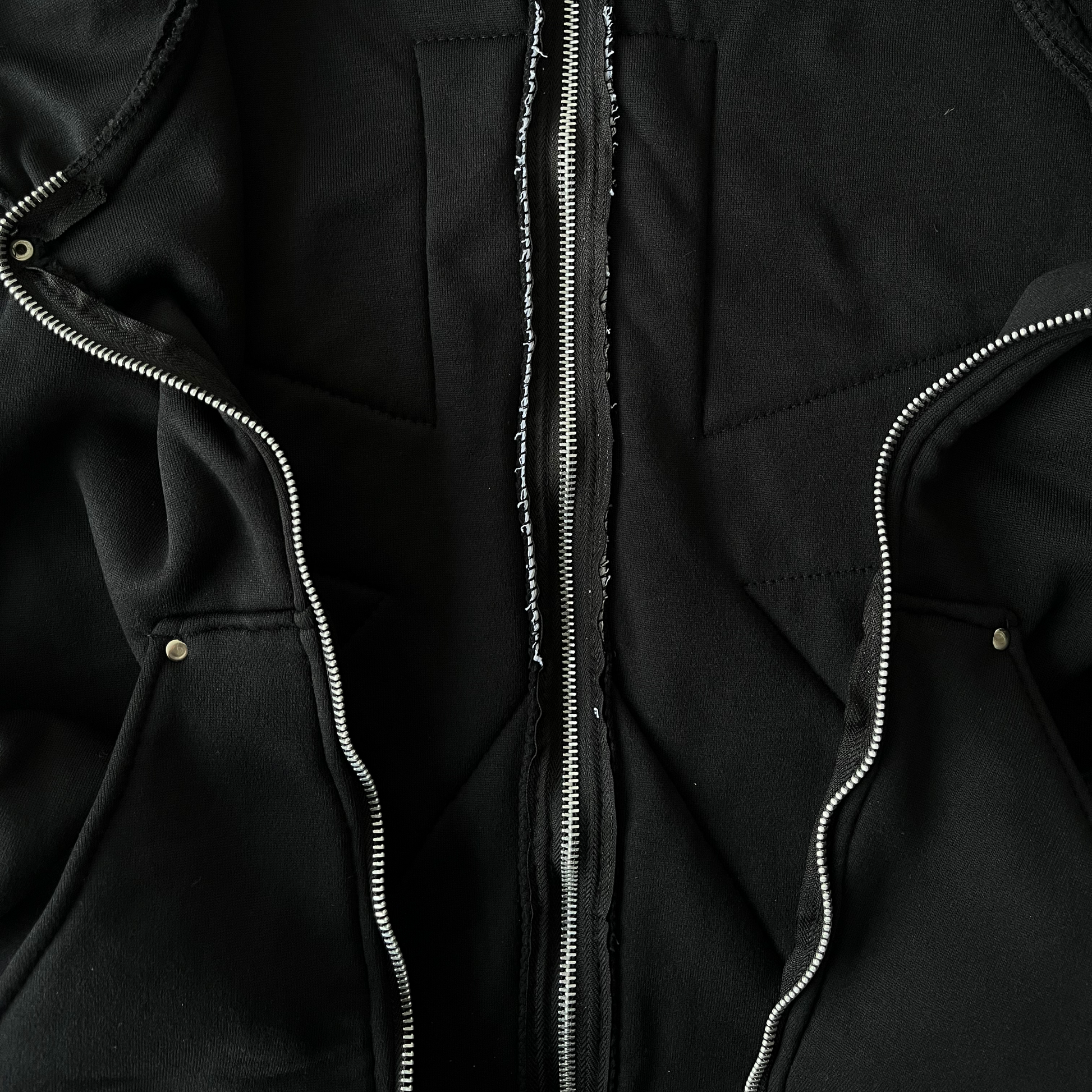 Make a statement with this black cropped zip-up hoodie, designed with an avant-garde edge. Featuring a bold, oversized white asterisk patch stitched onto the back with raw, frayed edges, it delivers a striking contrast against the dark base. The piece is finished with multiple exposed zippers running vertically along the body and center hood, giving it a deconstructed, industrial vibe. Ribbed cuffs and hem provide structure while maintaining comfort. Perfect for adding a rebellious, fashion-forward touch to any streetwear fit.