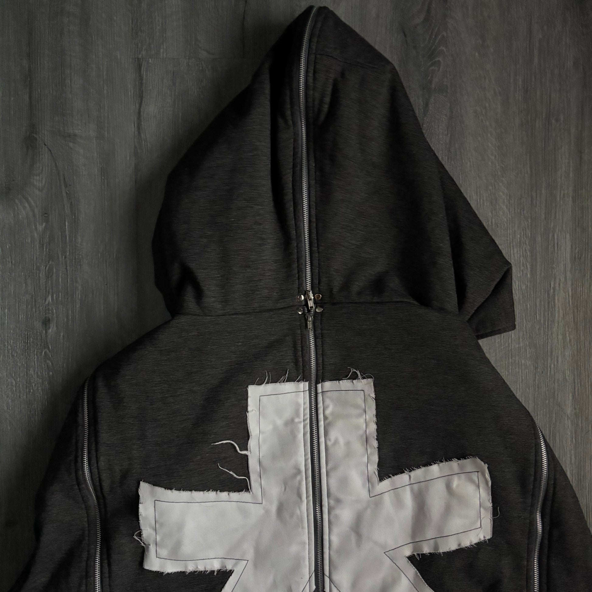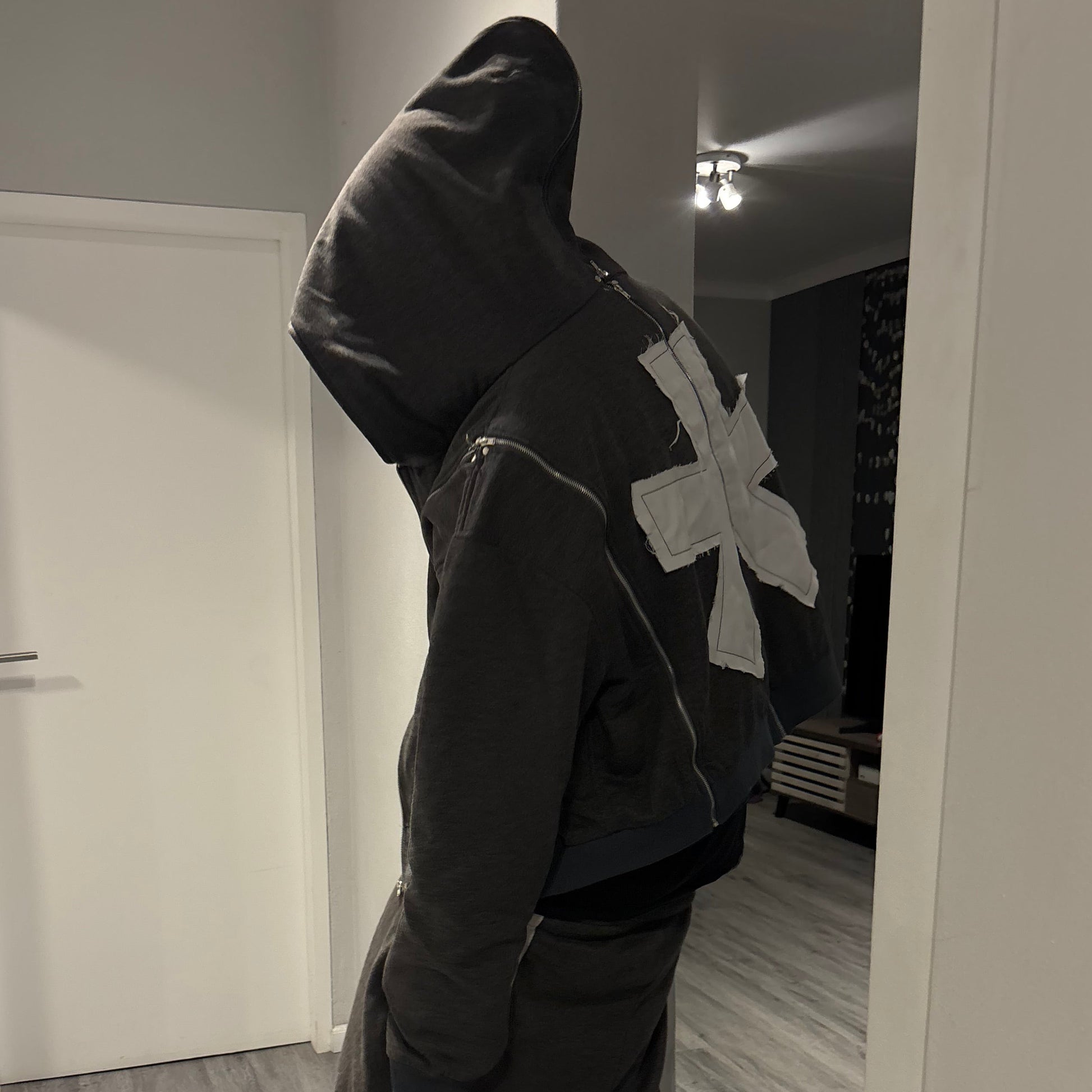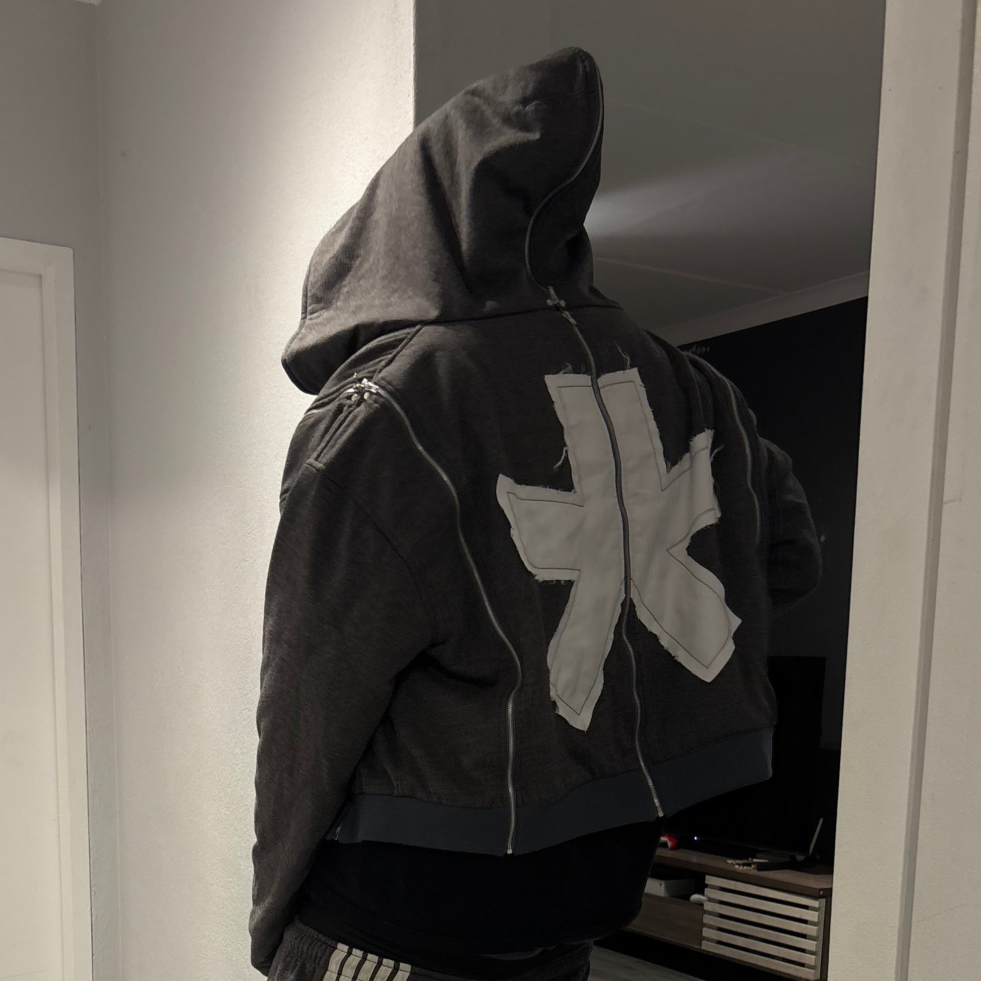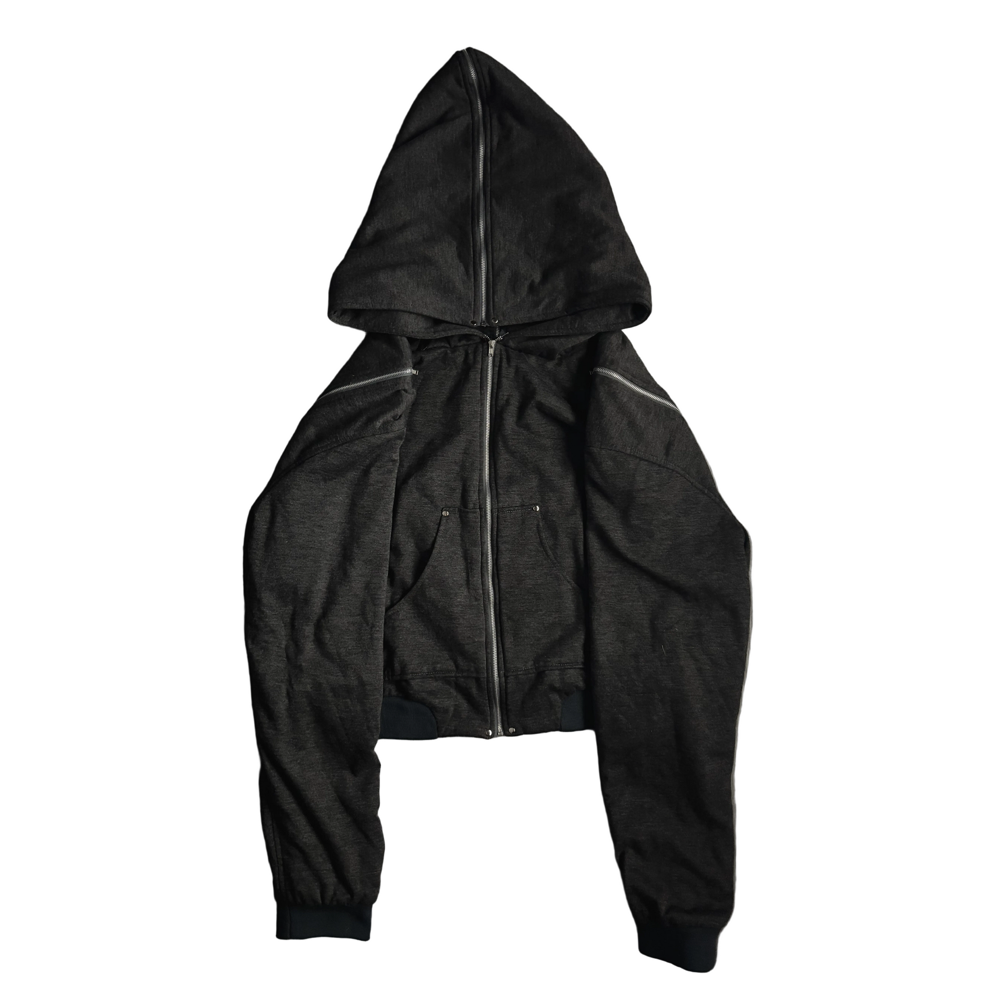 Make a statement with this black cropped zip-up hoodie, designed with an avant-garde edge. Featuring a bold, oversized white asterisk patch stitched onto the back with raw, frayed edges, it delivers a striking contrast against the dark base. The piece is finished with multiple exposed zippers running vertically along the body and center hood, giving it a deconstructed, industrial vibe. Ribbed cuffs and hem provide structure while maintaining comfort. Perfect for adding a rebellious, fashion-forward touch to any streetwear fit.