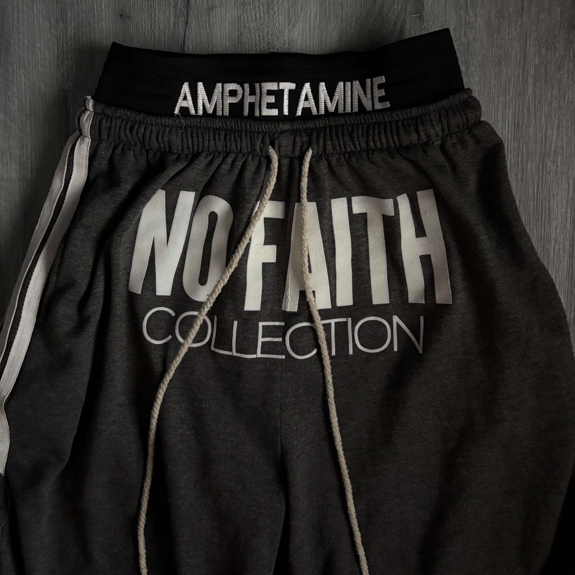 Bold Branding – Large “NO FAITH COLLECTION” print on the front and “AMPHETAMINE” on the waistband.